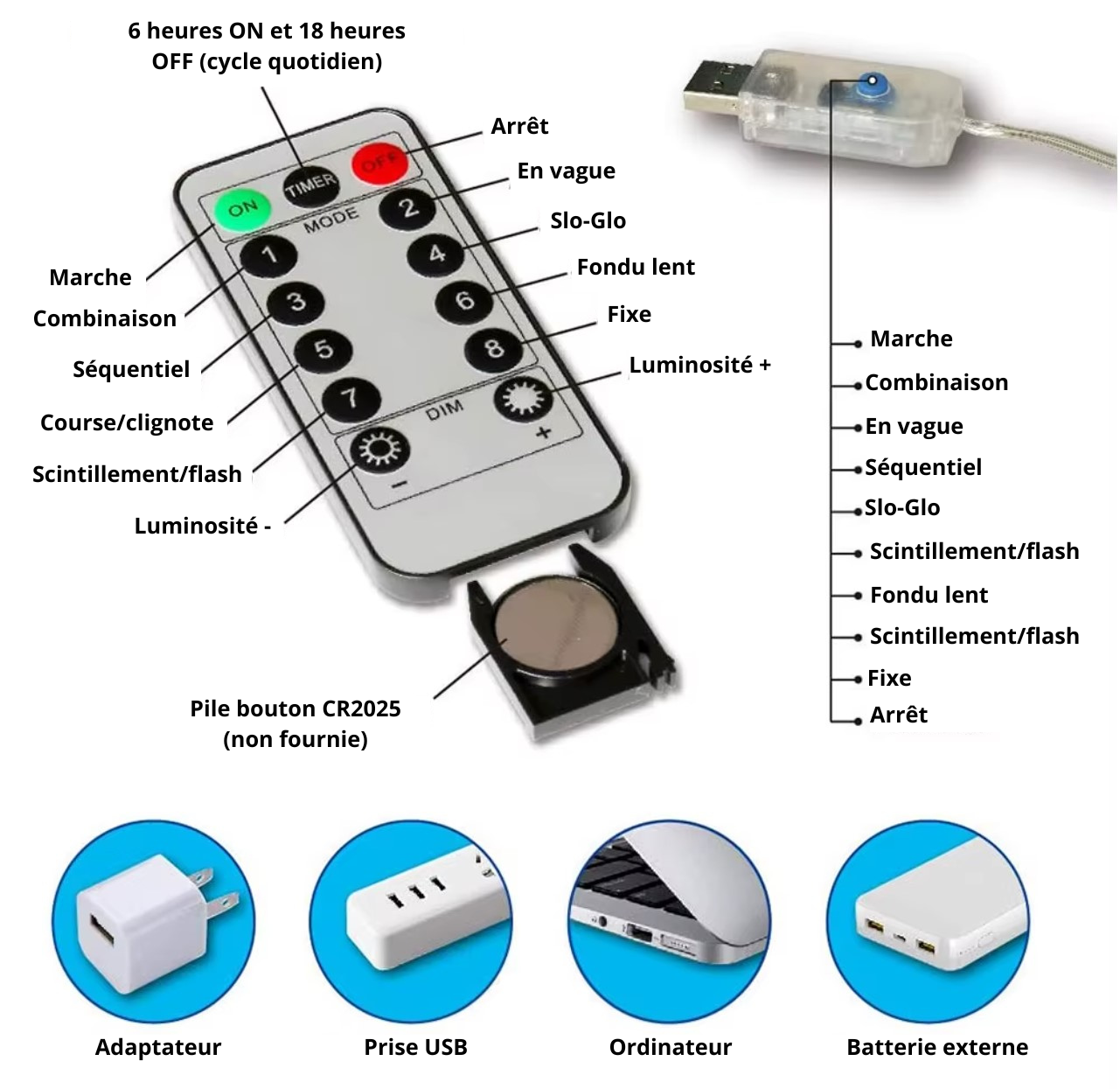 - Utilisation : Accrochez les rideaux selon vos préférences, branchez-les via USB et utilisez la télécommande pour choisir parmi les 8 modes d'éclairage.